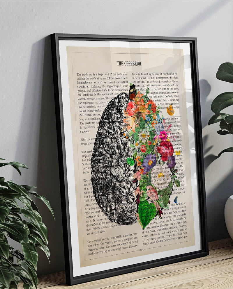 Unleash the beauty of the mind with this stunning Cerebrum Flower Art Print. This captivating design features a detailed illustration of the cerebrum, adorned with vibrant flowers and delicate butterflies. The background showcases a vintage-style medical description, adding a touch of intrigue and scientific interest. Perfect for doctors, students, or anyone fascinated by science and art, this print adds a touch of sophistication to any home, office, or classroom.