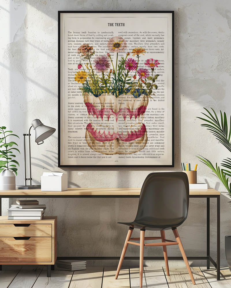 Transform your dental office or home with this captivating Teeth Anatomy Print, a beautiful blend of scientific detail and artistic charm. This unique dental art piece features a detailed diagram of a human tooth and jaw, elegantly interwoven with vibrant flowers and a descriptive, handwritten background. It's the perfect gift for a dentist, dental hygienist, orthodontist, or dentistry student, serving as a thoughtful and educational conversation starter. Available in various sizes, you can choose between a high-quality unframed poster or a professionally stretched, ready-to-hang canvas print to perfectly suit your space and style.